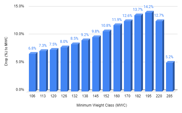 In this sample, 73,871 wrestlers had a certification weight exceeding their MWC. On average, this group had to drop 9.7% of their certification weight to reach MWC.